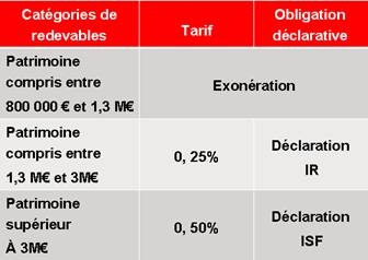 Toutes les personnes physiques dépassant un certain seuil de patrimoine, dont la valeur est appréciée au 1er janvier, sont redevables de l'impôt de Solidarité sur la Fortune (ISF). Au titre de 2012, l 'ISF n'est dû que par les personnes physiques dont le patrimoine net imposable excède un seuil fixé à à 1,3 Mions d'euros (imposition dès le 1er euros)..