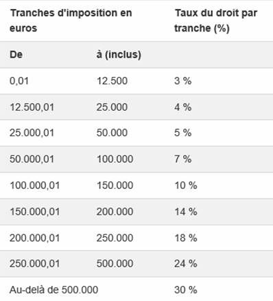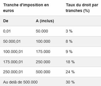 Dossier spécial expatriation à Bruxelles, cliquez ici >> Les taux applicables aux droits de donation et de succession sont de la compétence des Régions. Les barèmes sont progressifs, ils dépendent donc du montant des biens transmis, sauf exceptions. Par ailleurs, les taux varient également, comme en France, en fonction du lien de parenté.